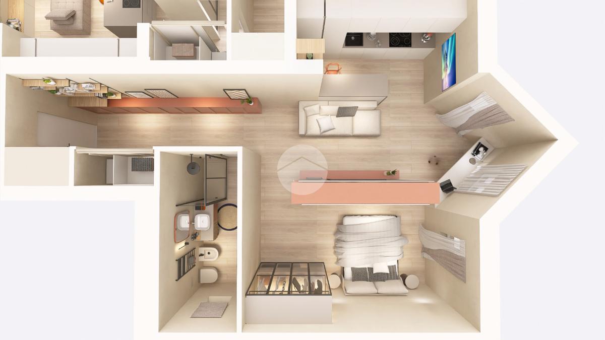 Facciamo il nostro ingresso nel corridoio che ci conduce nella zona giorno composta da cucina e soggiorno open space, camera da letto matrimoniale, e bagno finestrato con doccia.