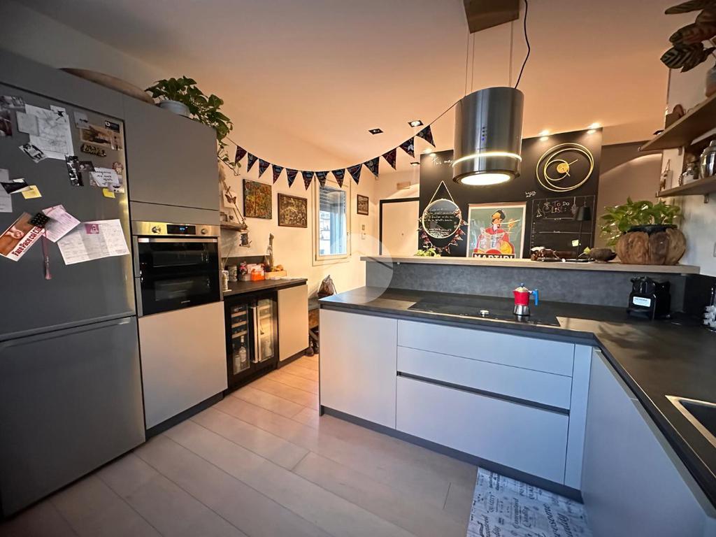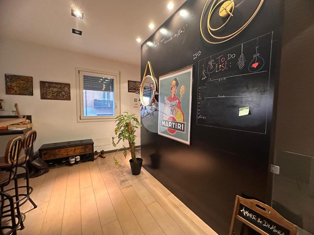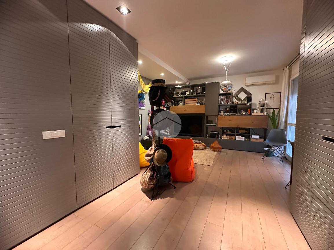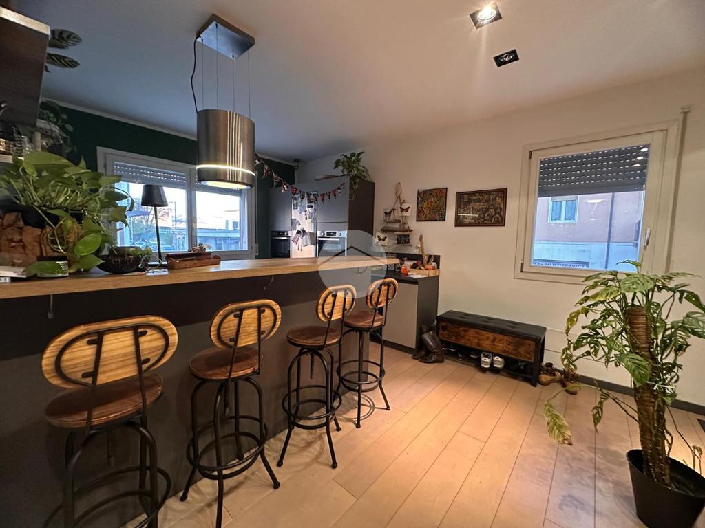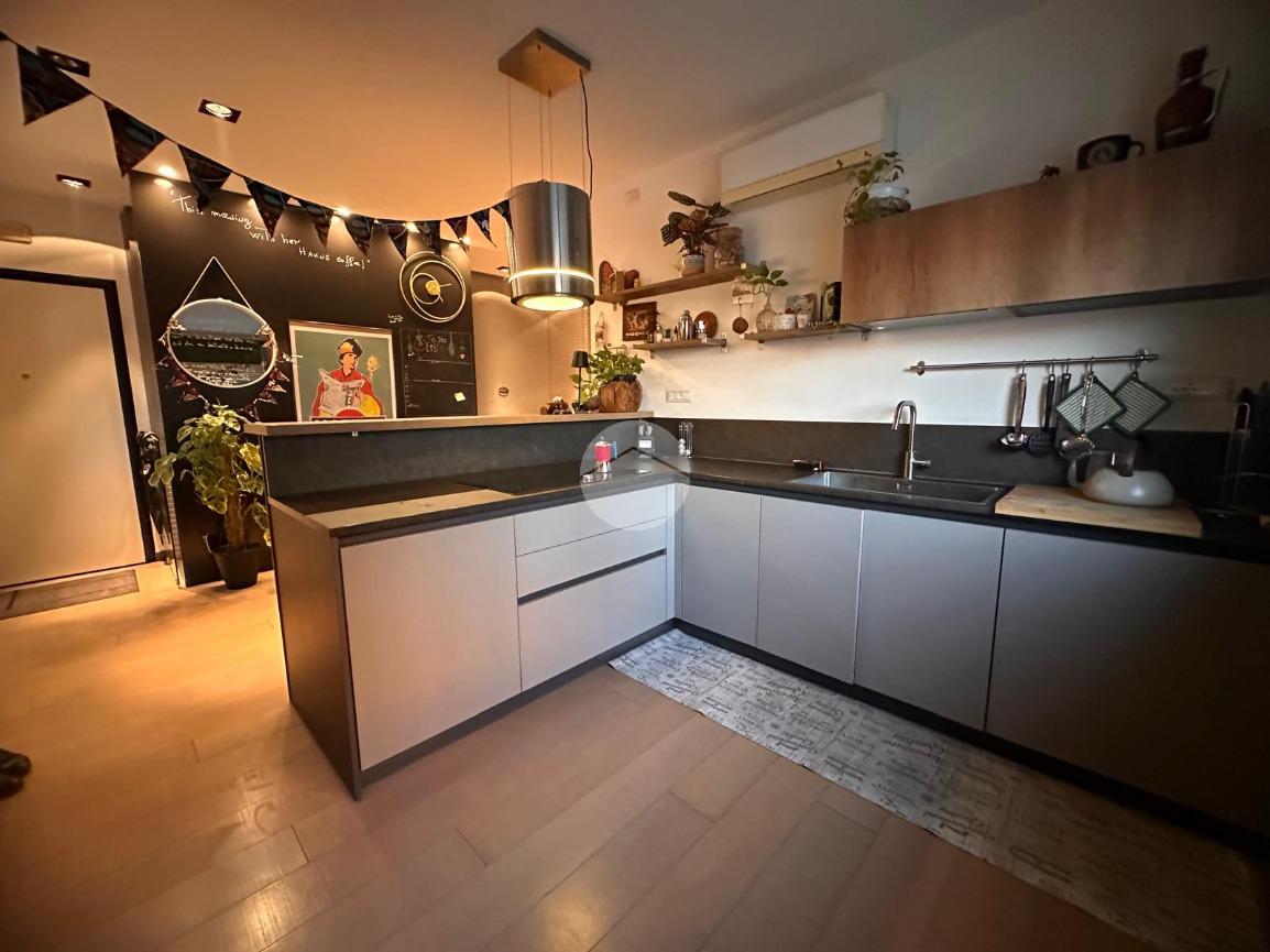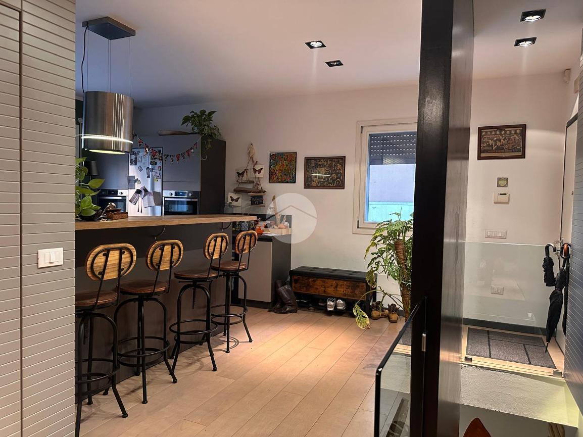 Tramite l'ascensore raggiungiamo il primo piano, dove accediamo tramite la porta blindata nella cucina arredata su misura con piano ad induzione, proseguendo abbiamo a vista il soggiorno con sfogo sul terrazzino esposto a Nord.